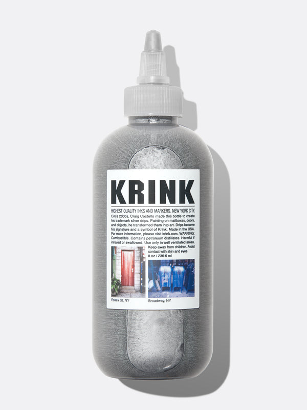 Warning: Contains petroleum distillates. Contains harmful solvents. Flammable. Harmful if swallowed. Keep away from children. For professional use only. Krink Silver should be stored at room temperature and out of direct sunlight.